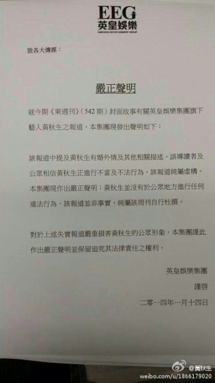 “就今期《东周刊》(542 期)封面故事有关英皇娱乐集团旗下艺人黄秋生之报道,本集团现发出声明如下: